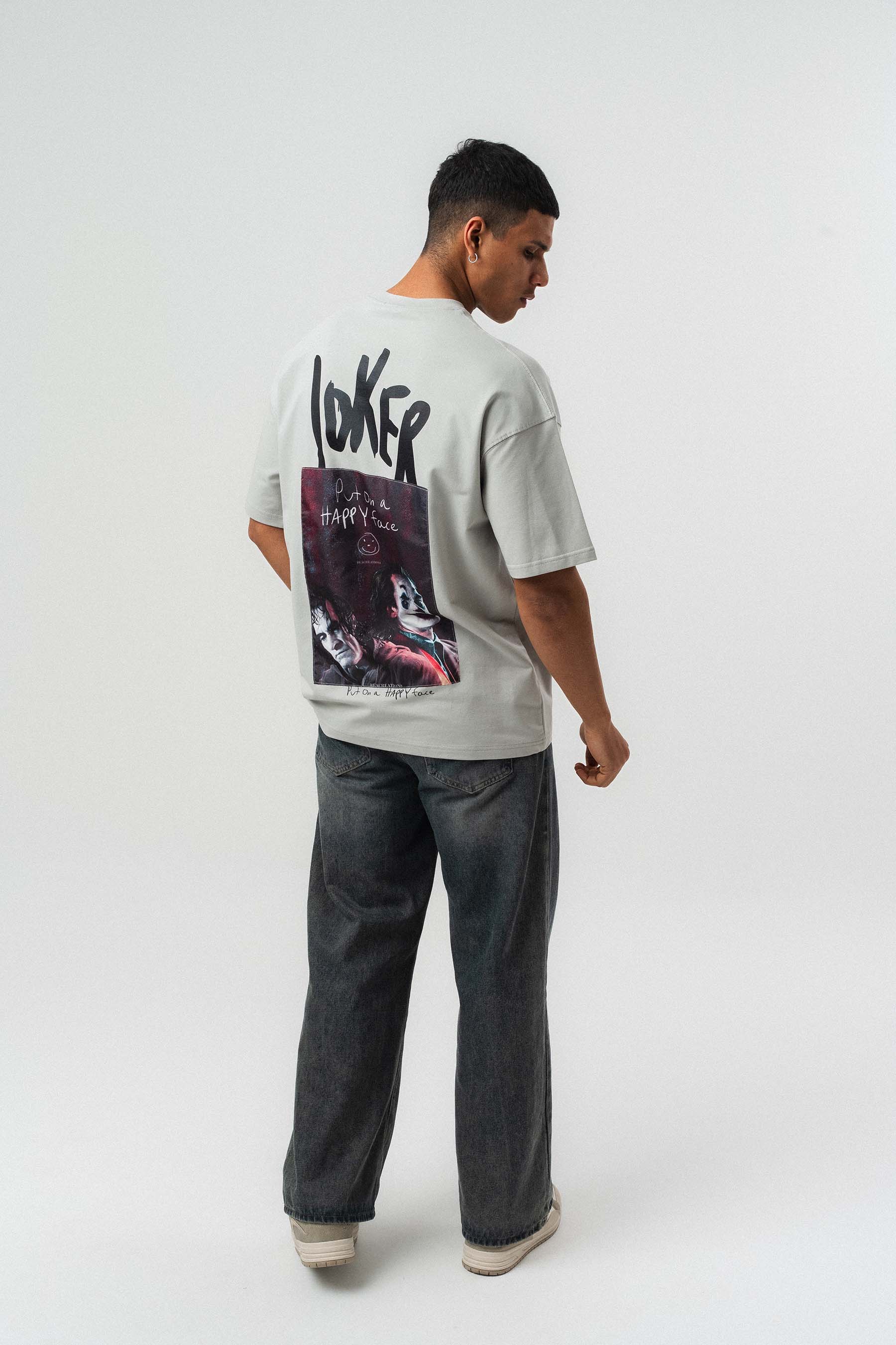 • Joker Put On Happy Face Baskılı Gri Oversize Baskılı T-Shirt