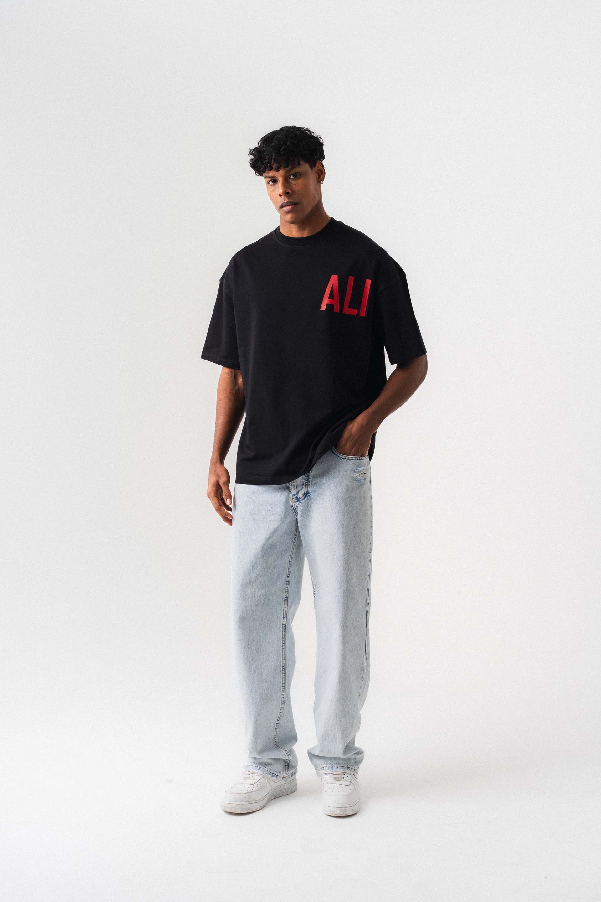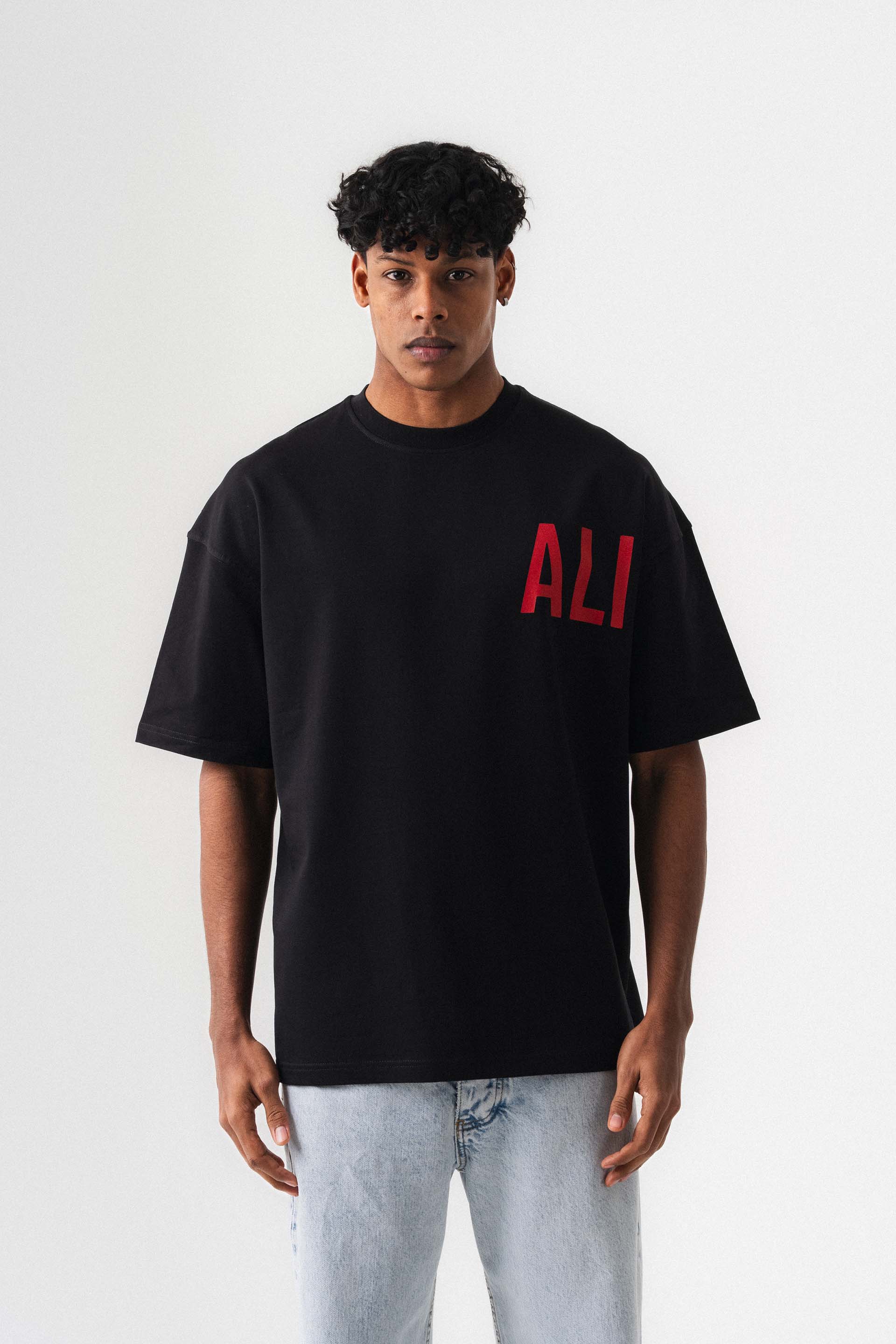 Muhammed Ali Siyah Oversize Baskılı T-Shirt, grafik baskı diliyle tasarlanmış oversize kalıplı bir t-shirttür.