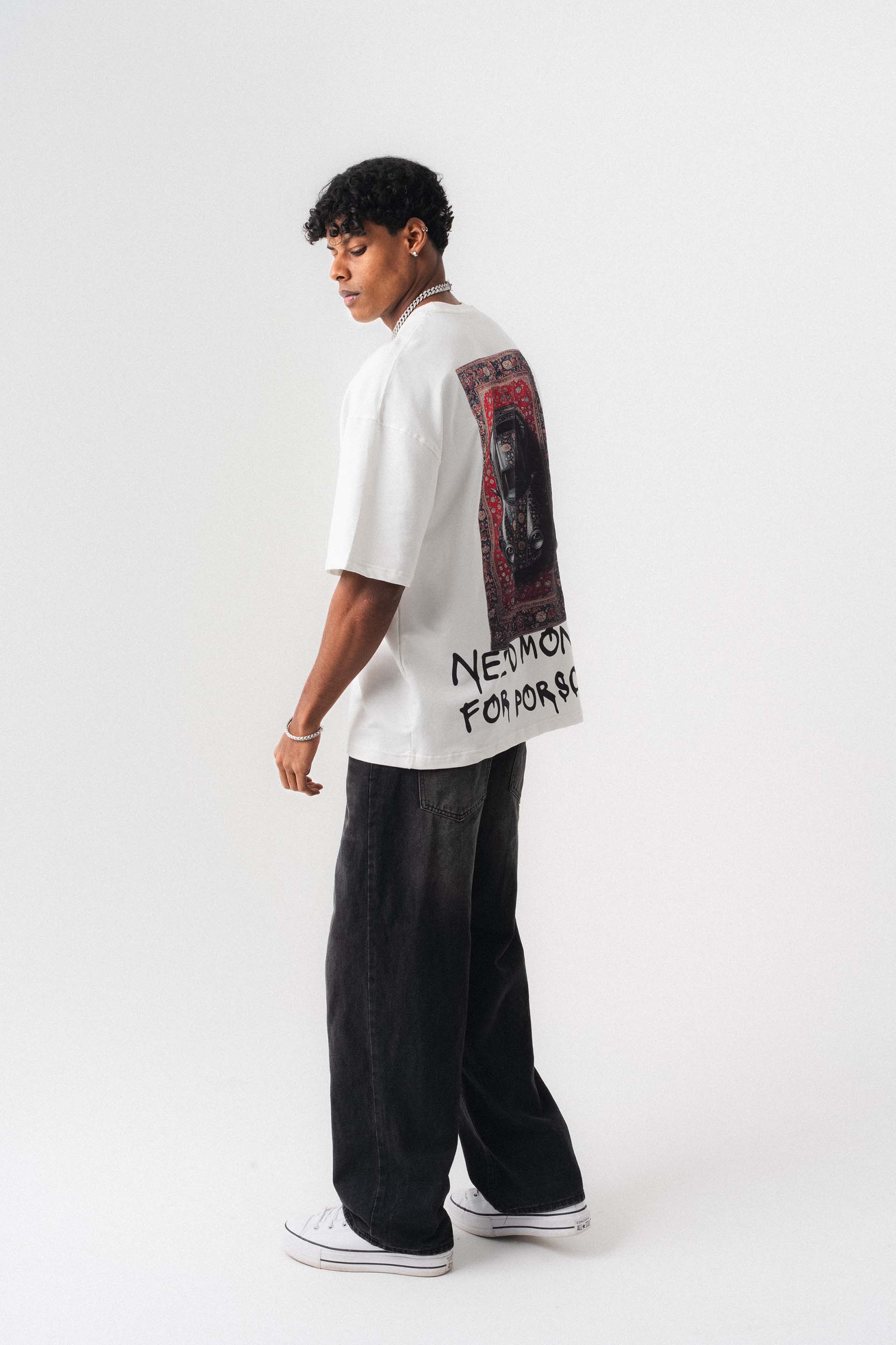 Need Money For Porsche Beyaz Oversize Baskılı T-Shirt, grafik baskı diliyle tasarlanmış oversize kalıplı bir t-shirttür.