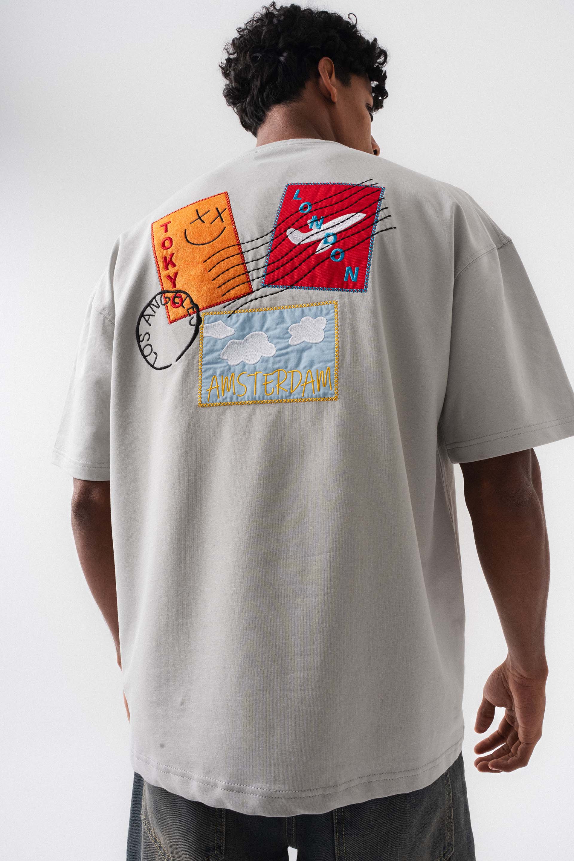 Tokyo Patchli Gri Oversize Baskılı T-Shirt